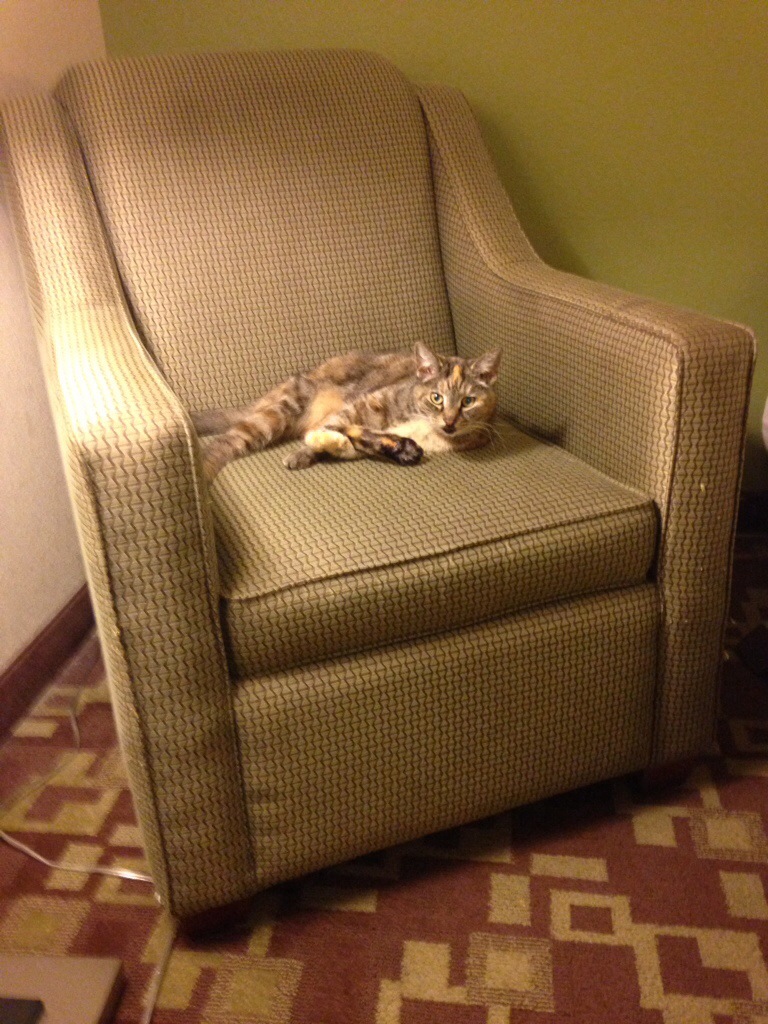 Arrived in Tupelo, famous as the birthplace of Elvis Presley, around 5:30. Long day but tomorrow’s trip is scheduled for only 9 hours. Cats were good travelers, Lucy slept the whole way. Chinese take-out was the worst ever, so I’m glad I brought Larabars. And scotch. More tomorrow…..